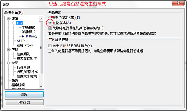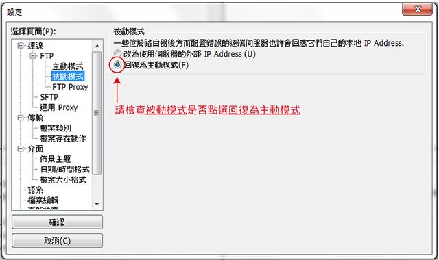 請進入編輯>設定>FTP>被動模式請點選回復為主動模式(F)