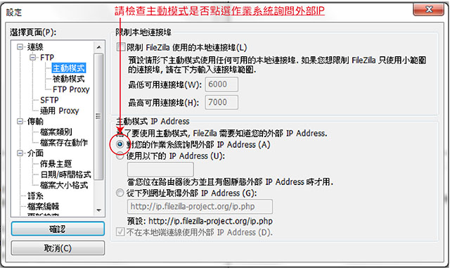 請進入編輯>設定>FTP>主動模式>主動模式IP Address請點選對您的作業系統詢問外部 IP Address(A)